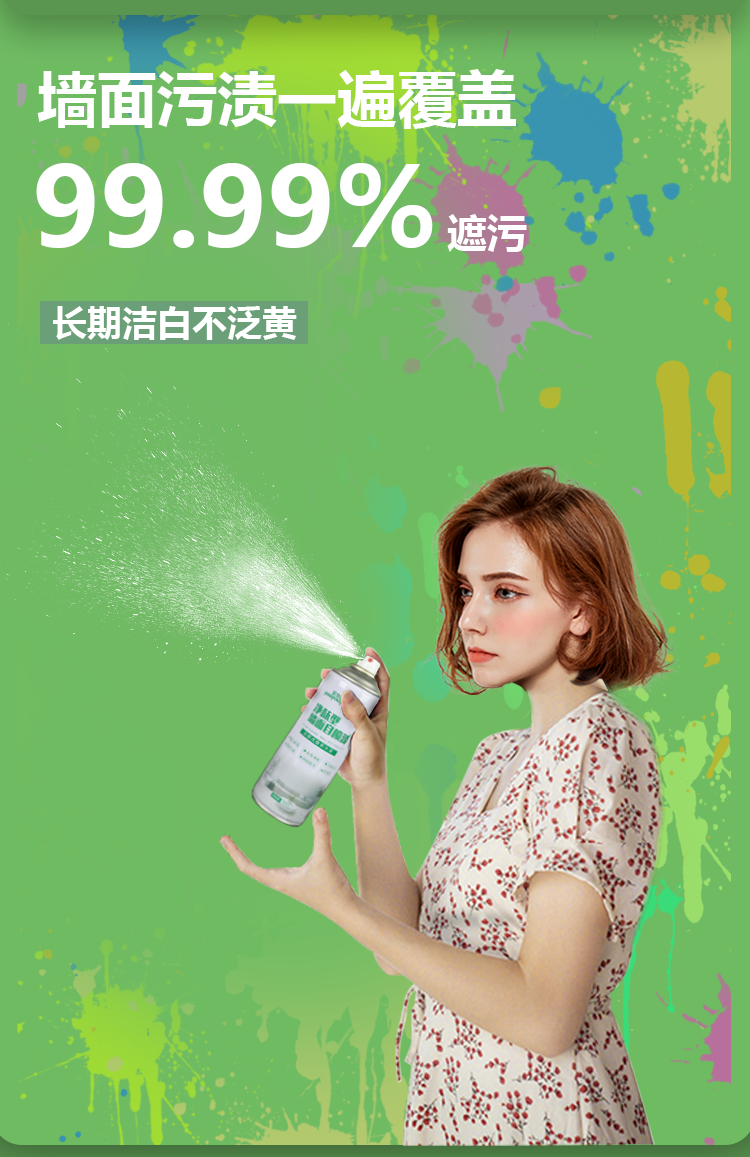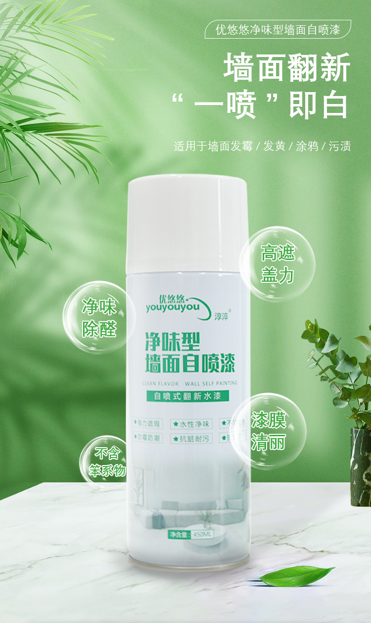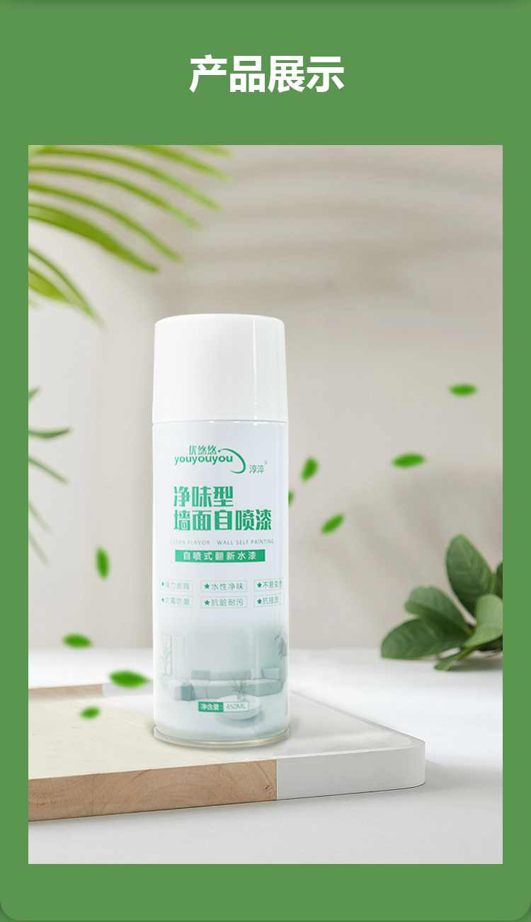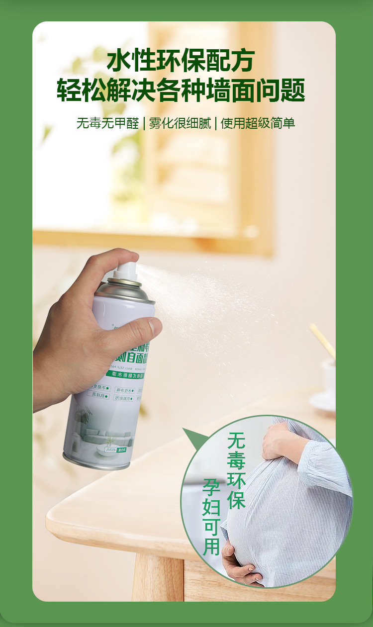 采用环保水性配方,低气味、快干(表干15分钟),覆盖力强,可遮盖细小裂纹。喷涂均匀,无需专业工具,即开即用。附着力优异,耐轻微擦洗,适用于小面积翻新、DIY装饰等场景。规格:450ml/罐,建议施工温度5-35℃。使用前摇匀,距离表面20-30cm喷涂
