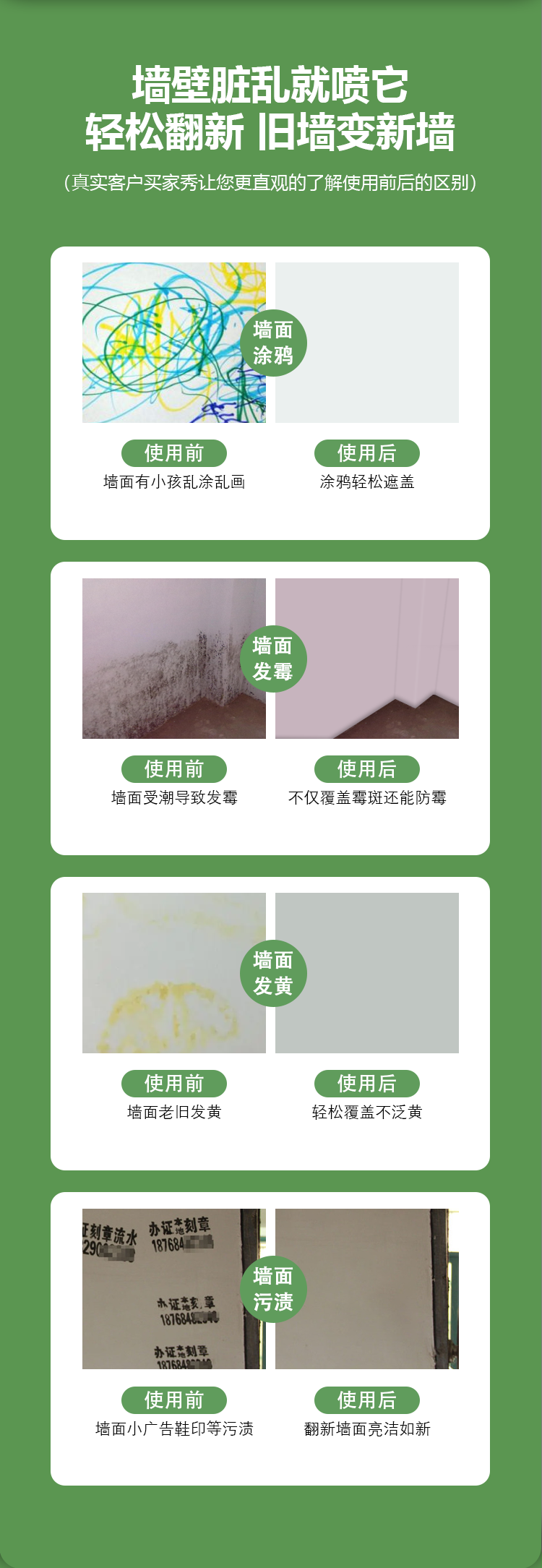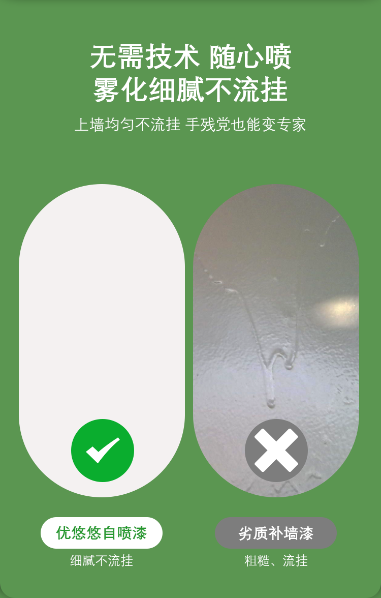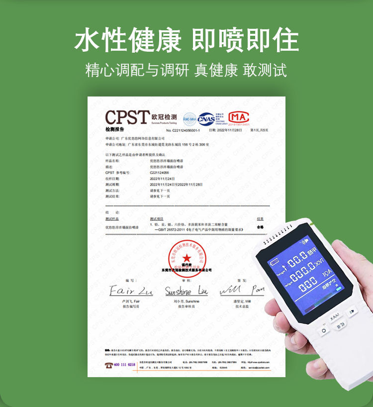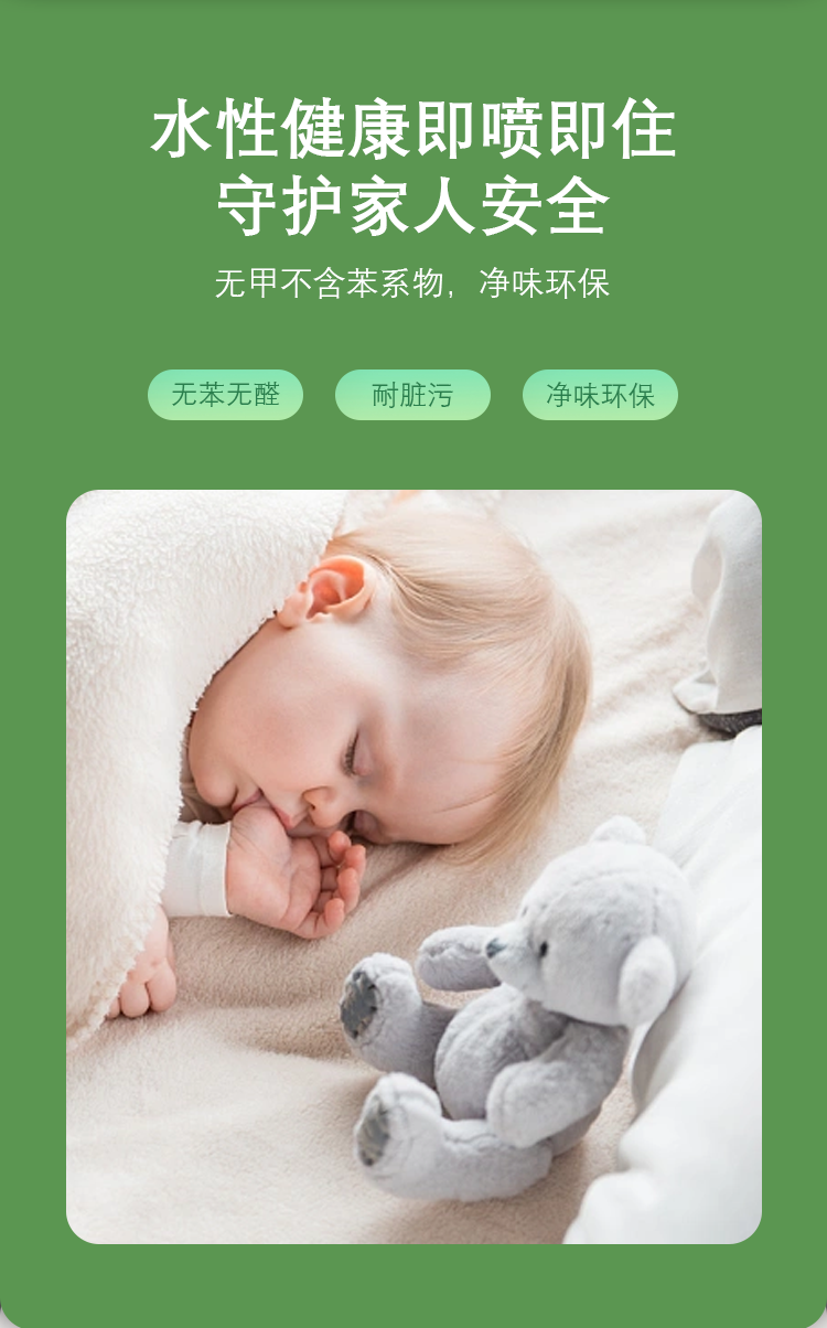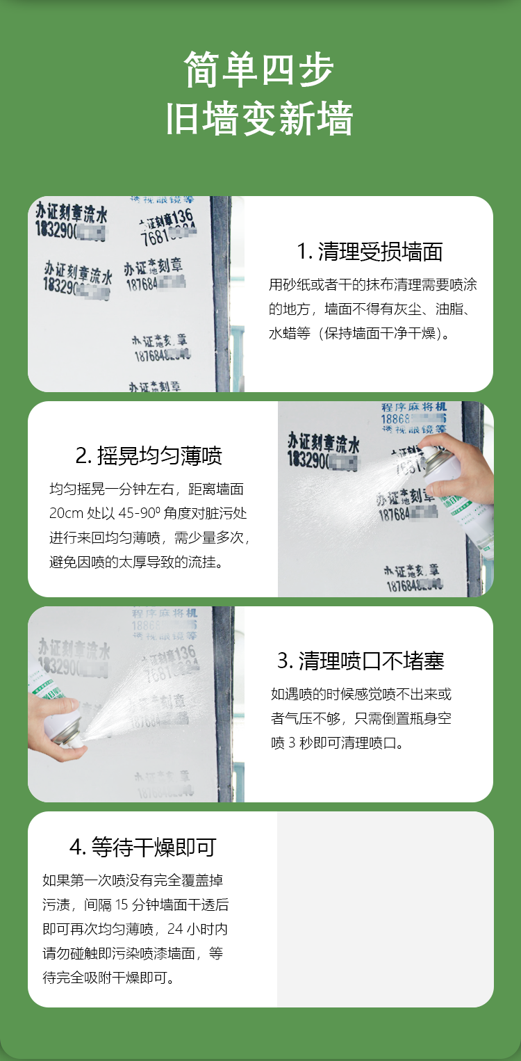 采用环保水性配方,低气味、快干(表干15分钟),覆盖力强,可遮盖细小裂纹。喷涂均匀,无需专业工具,即开即用。附着力优异,耐轻微擦洗,适用于小面积翻新、DIY装饰等场景。规格:450ml/罐,建议施工温度5-35℃。使用前摇匀,距离表面20-30cm喷涂